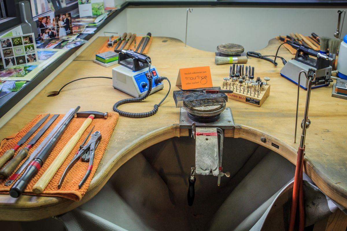 Ihr erlangt Einblicke in das Walzen, Biegen, Sägen, Löten, Feilen, Schmirgeln, Polieren und alles, was sonst noch zum Goldschmieden dazugehört. In Euren Händen formt sich das Metall zu einem Schmuckstück.